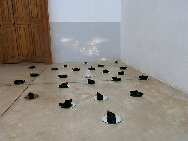 La instalación consta de 23 velas en forma de barcos negros, un barco blanco que en el centro tiene una casa y 30 espejos circulares que representan el agua.
