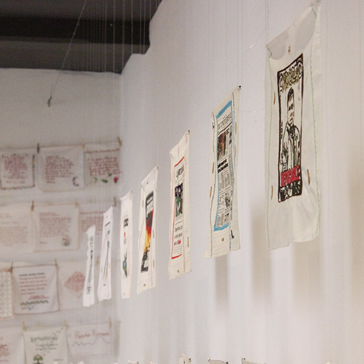 It is a artwork based on the endless chain of deaths that the drug trafficking is leaving in Mexico. With four elements; a red wool string Teotitlan del Valle, Oaxaca ; a series of poppy flowers (made with a huipil of the Triqui community), representing the seedling that follows the course of this river – chain. A single, hand-embroidered in red with the name of “farmer” savannah ; which refers to the Marijuana King of Oaxaca, the drug trafficker Pedro Diaz Parada. He was arrested when the officers asked him- What is your job- and he anserwed ” Farmer ” -with a real and full of irony response. Next, tissue newspapper of embroidered fabric, referred the death toll left by the war on drugs.